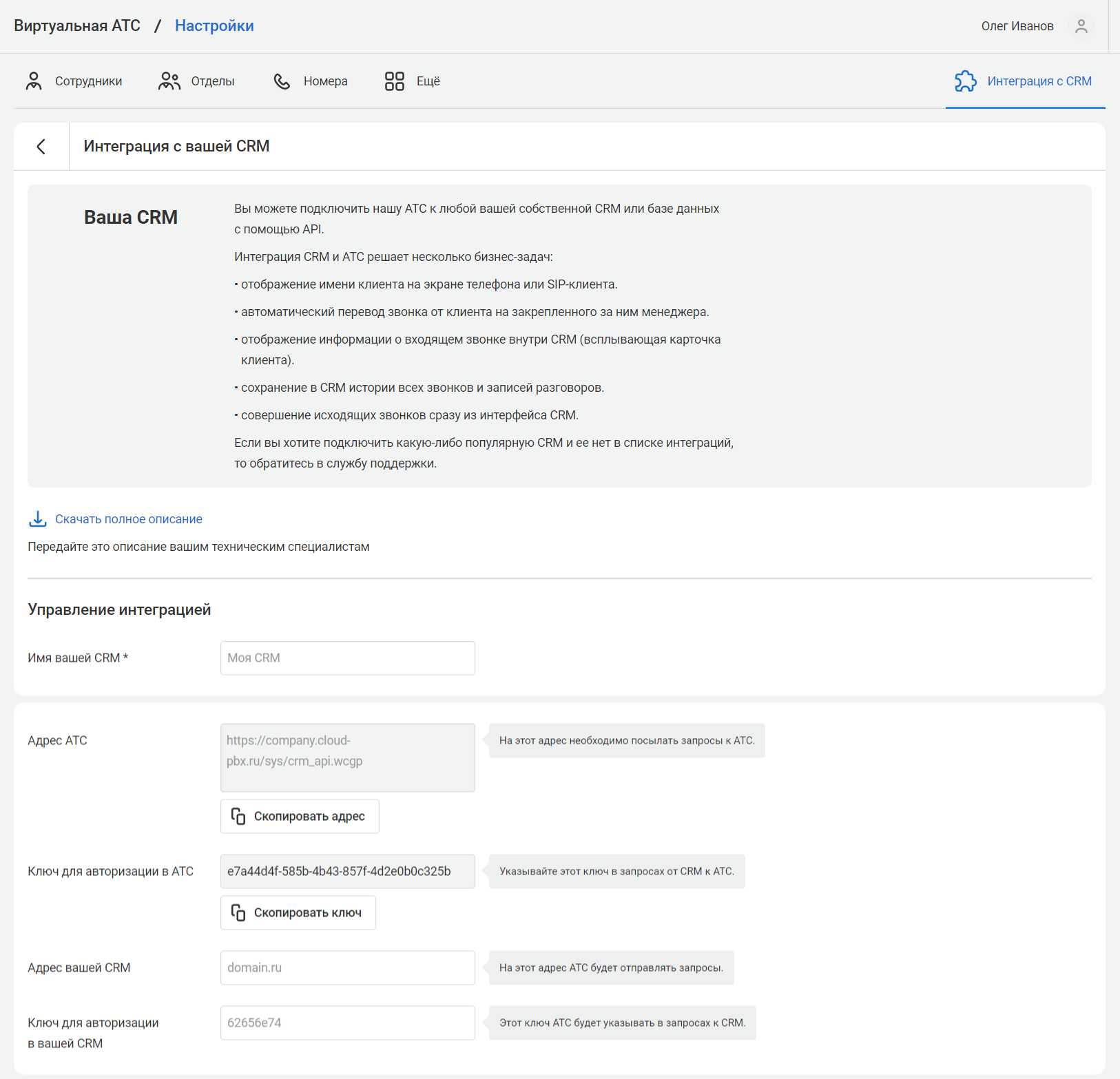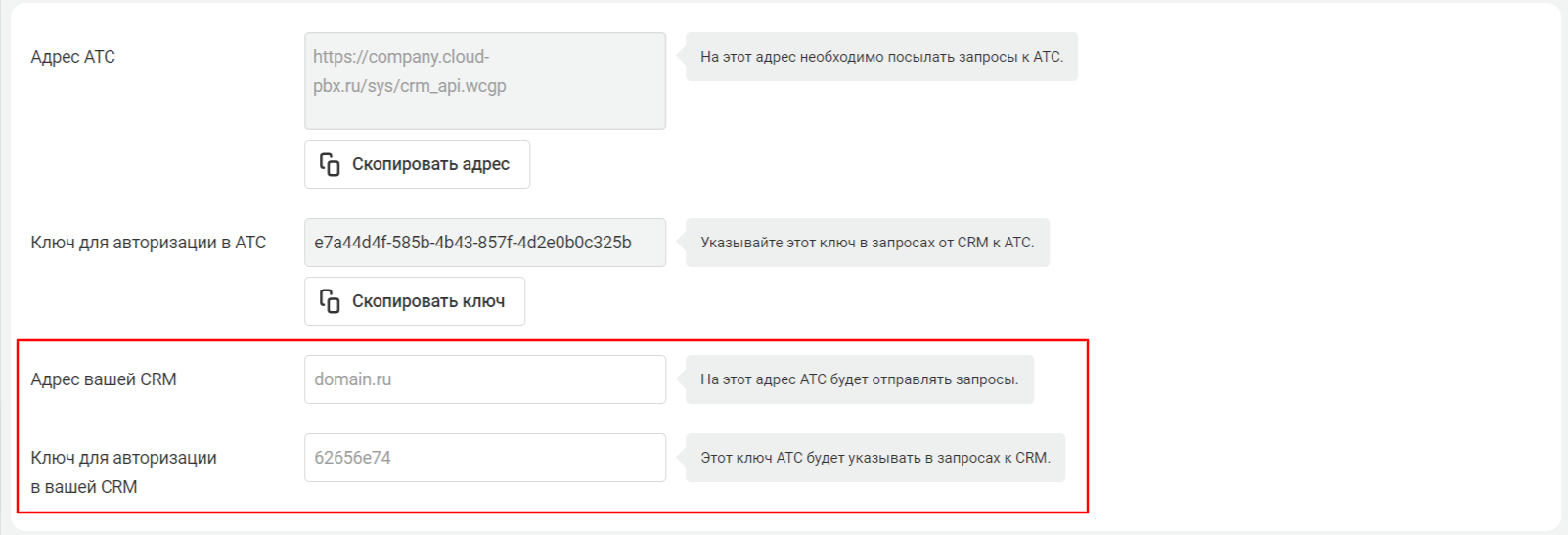 - Ключ для авторизации в CRM: вводим произвольный ключ который будет совпадать с таким же параметром в личном кабинете АТС