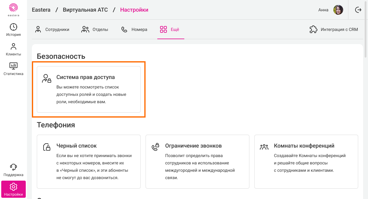 Чтобы посмотреть возможности ролей или изменить их, в настройках АТС перейдите на вкладку «Еще». В разделе «Безопасность» кликните на блок «Система прав доступа».