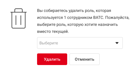 2. Если роль используется сотрудниками, появится предупреждение с просьбой назначить этим сотрудникам другую роль вместо текущей.