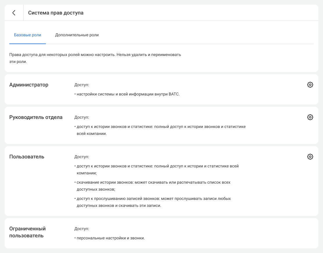 Доступ пользователя к истории звонков, статистике, скачиванию записей и их прослушиванию можно настроить по-разному. Чтобы изменить текущие настройки доступа, нажмите на шестеренку справа от роли «Пользователь».
