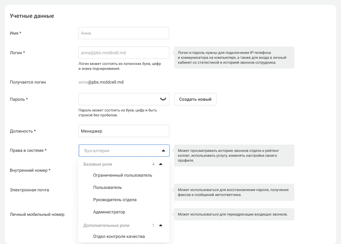 Каждая компания может сама решать, какие права доступа предоставлять рядовым сотрудникам, руководителям отделов и администраторам АТС. По умолчанию в АТС есть 4 уровня доступа: администратор, руководитель отдела, пользователь и ограниченный пользователь. Также можно настроить дополнительные роли, которые лучше подойдут для вашей компании.