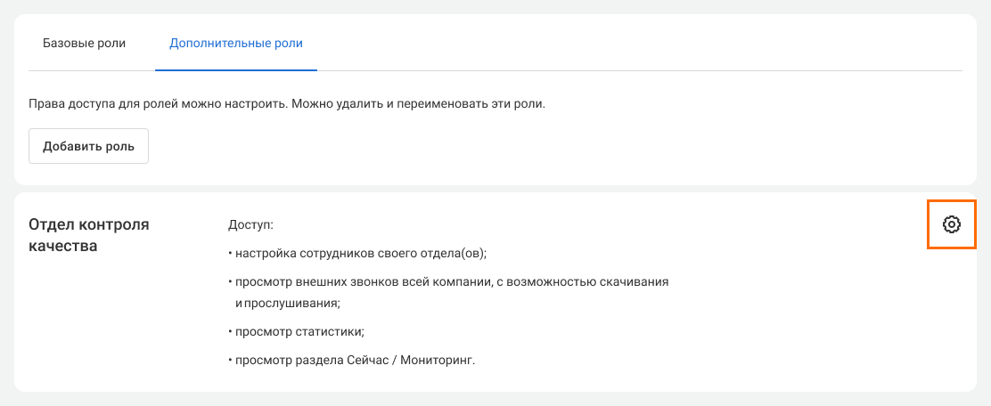 Также по умолчанию руководитель отдела имеет доступ к истории и статистике звонков своего отдела. Если хотите дать руководителю отдела доступ к истории и статистике по всей компании, нажмите на шестеренку рядом с этой ролью.
