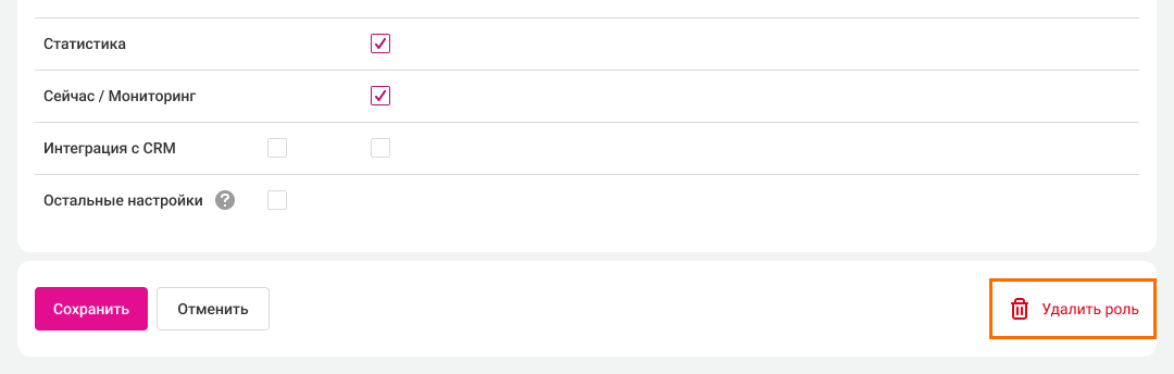 - Интеграция с CRM — можно настроить доступ для просмотра или редактирования настроек интеграций CRM.