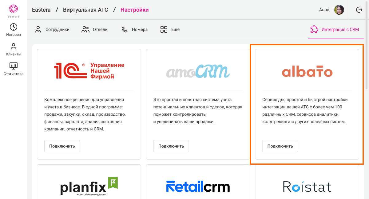 1. В настройках АТС перейдите в раздел «Интеграция с CRM». В списке интеграций найдите виджет Albato, нажмите «Подключить».