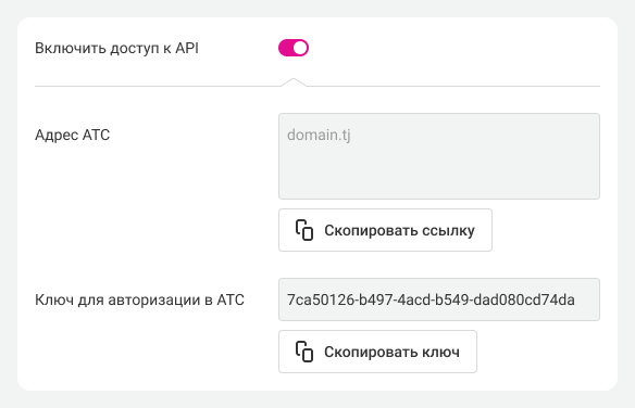2. Включите доступ по API. Скопируйте адрес вашей АТС и ключ для авторизации.