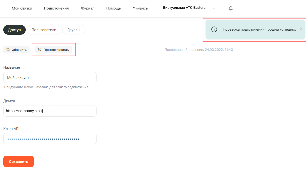 • Ключ API – вставьте скопированное значение поля «Ключ для авторизации в АТС».