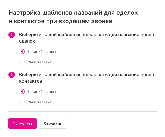 3. В меню ниже выберите, с чего будет начинаться название сделки при входящем звонке: дата и время создания сделки или номер телефона клиента. По этим параметрам проще всего отличить одну сделку от другой.