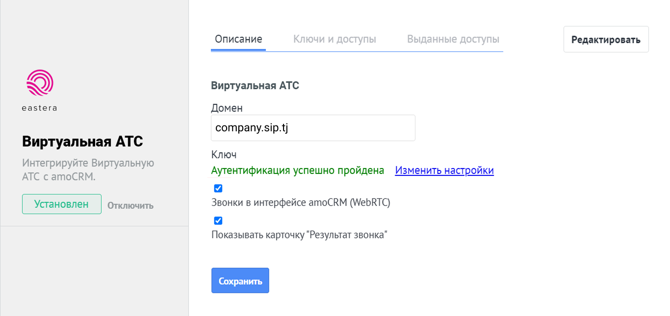 В amoCRM зайдите в раздел «Настройки» — «Интеграции» — «Виртуальная АТС», выберите «Звонки в интерфейсе amoCRM (WebRTC)» и «Показывать карточку «Результат звонка»».
