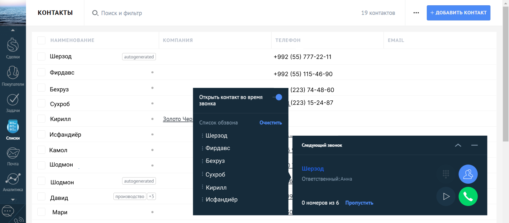 Если менеджеру необходимо позвонить большому количеству клиентов, он может сэкономить время, создав в amoCRM список контактов для обзвона и запустив его через виджет.