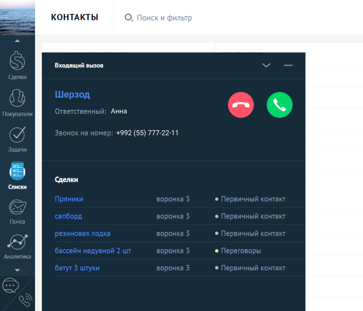 При поступлении входящего звонка вы не только увидите всплывающую карточку с доступной информацией о клиенте, но и сможете принять звонок, кликнув на зеленую трубку виджета.