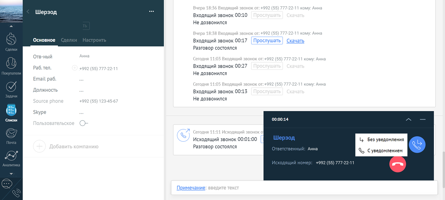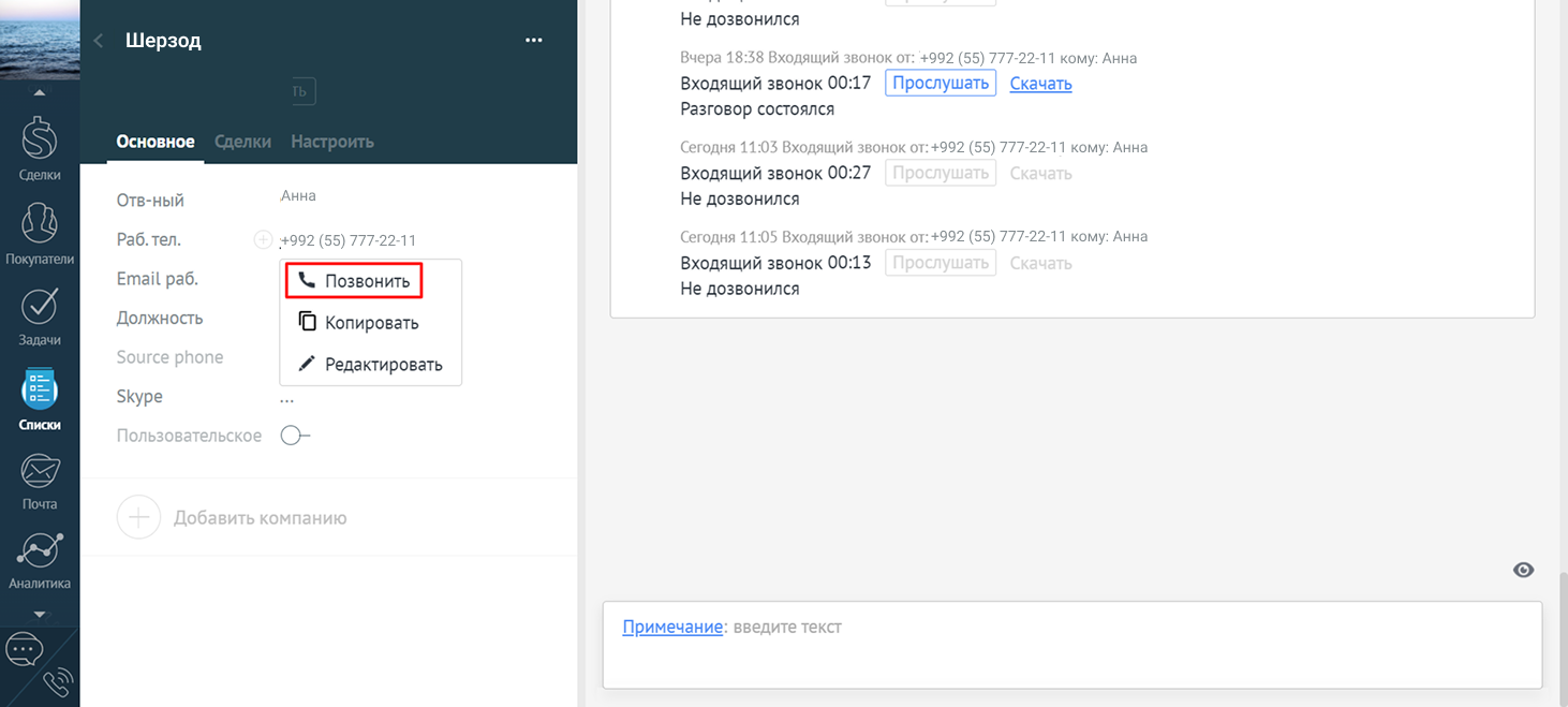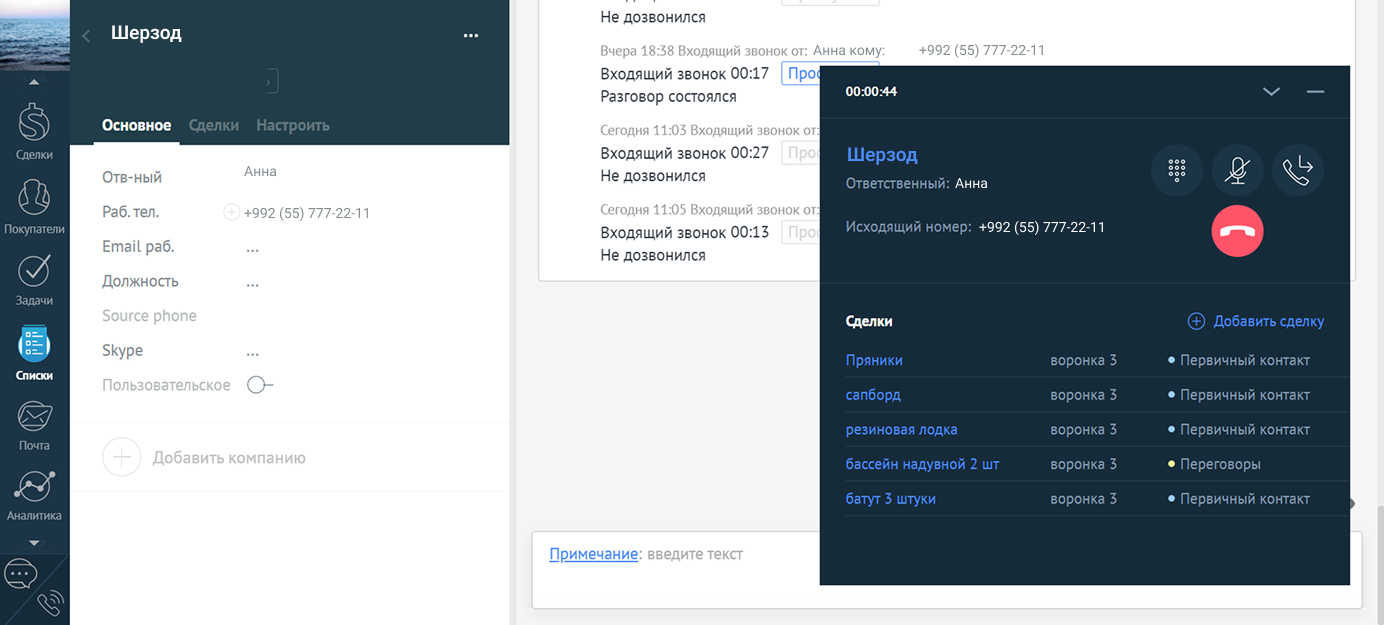 • создать новую сделку по результатам звонка (она будет связана с выбранным контактом),