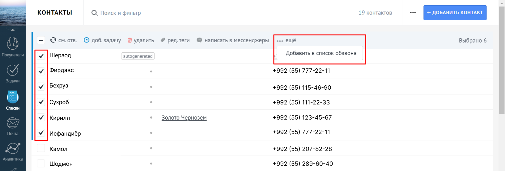 Чтобы создать список обзвона, в списке контактов выберите несколько имен, нажмите «Еще» и «Добавить в список обзвона».