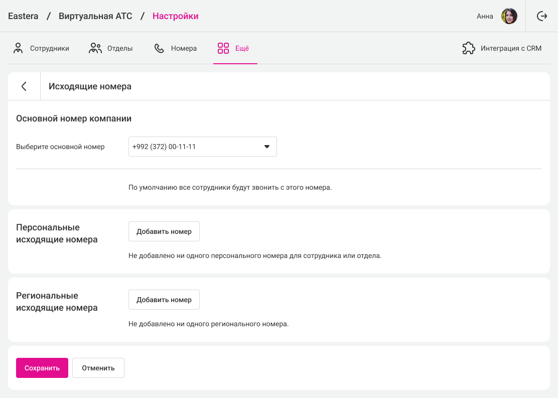 • Основной – с этого номера будут осуществляться все звонки, кроме тех, для которых назначены персональные и региональные номера.