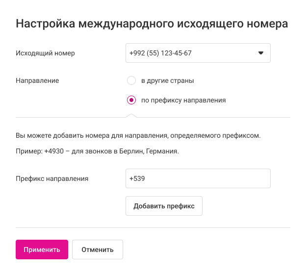 Если вы не нашли нужное направление звонков в списке других стран, можете назначить исходящий номер по префиксу этого направления. Например, вы можете установить отдельный исходящий для звонков на локальные городские номера.