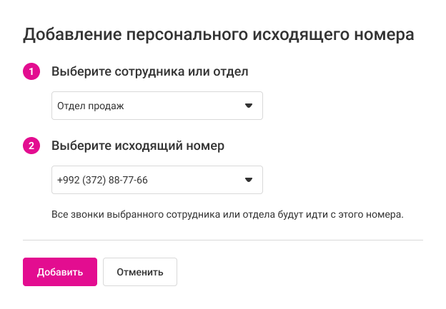 Назначьте сотрудникам и отделам номера, которые будут определяться при исходящих звонках.