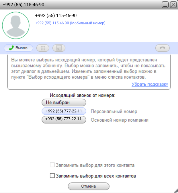 Если сотруднику доступен персональный номер и номер отдела, при исходящем звонке будет подставлен персональный номер.