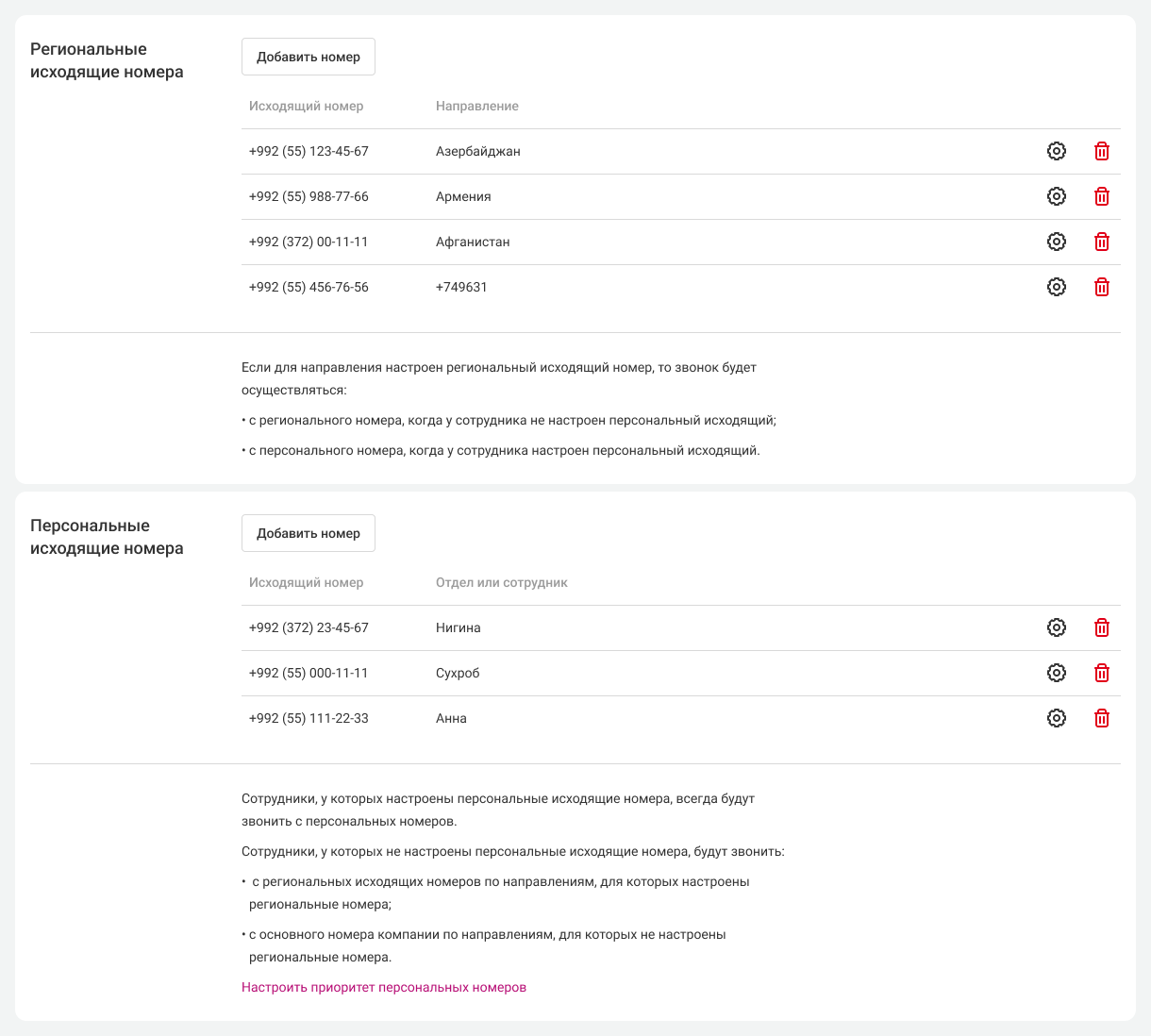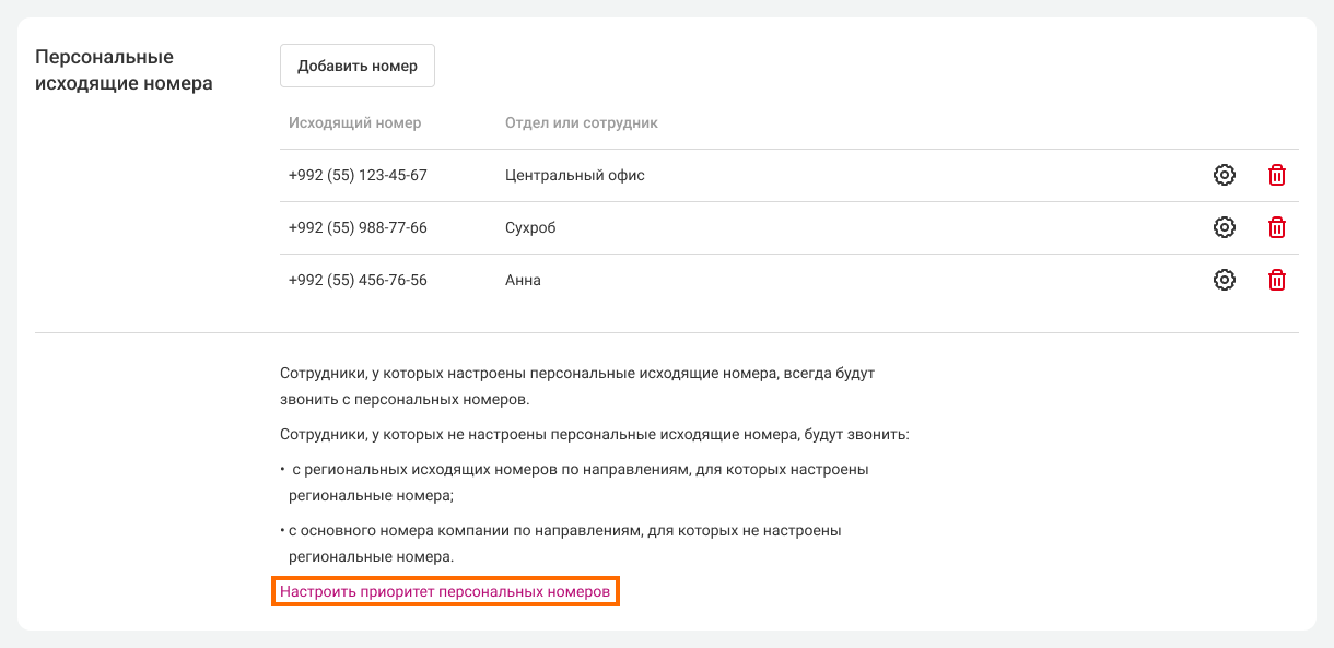 5. Назначьте персональные номера остальным сотрудникам. Проверьте, все ли корректно настроили. Если необходимо, отредактируйте настройки, нажав на шестеренку. Если хотите удалить этот номер из списка персональных, нажмите на корзину справа от номера.