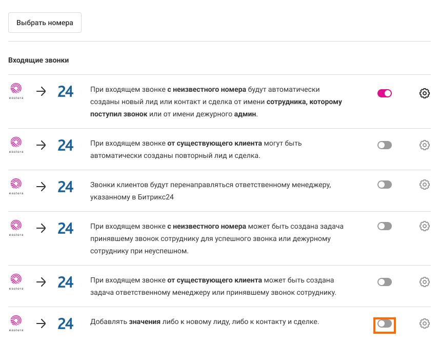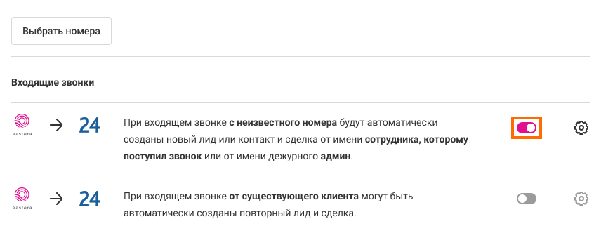 1. В интерфейсе АТС перейдите в: «Настройки» — «Интеграция с CRM» — «Интеграция с Битрикс24» — сценарии интеграции для входящих звонков. 2. Включите автоматическое создание лидов, контактов и сделок в интерфейсе АТС.
