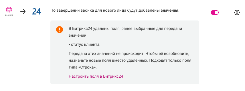 Чтобы возобновить передачу данных, добавьте поле в Битрикс24 и заново сопоставьте его в АТС с нужным значением.