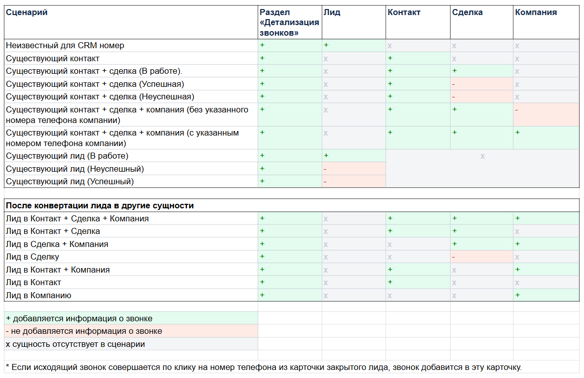 Звонок по клику на номер контакта считается обычным исходящим звонком и добавляется во все связанные сущности. Единственная особенность — если звонок совершается по клику из карточки закрытой сущности, такой звонок, будет добавлен еще и в эту карточку.