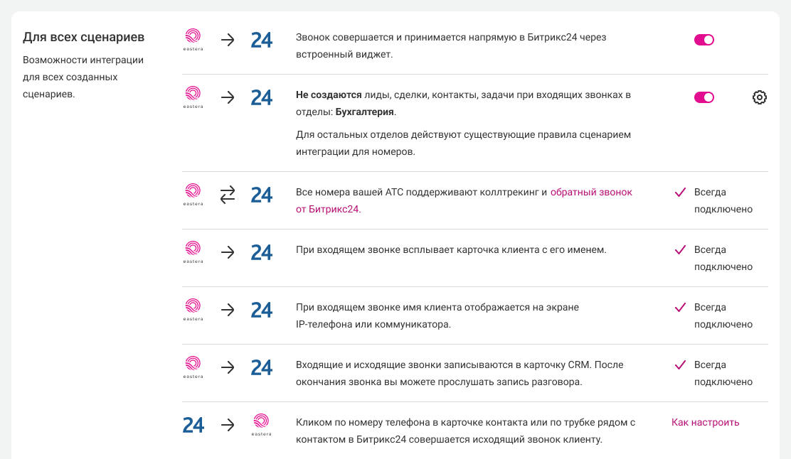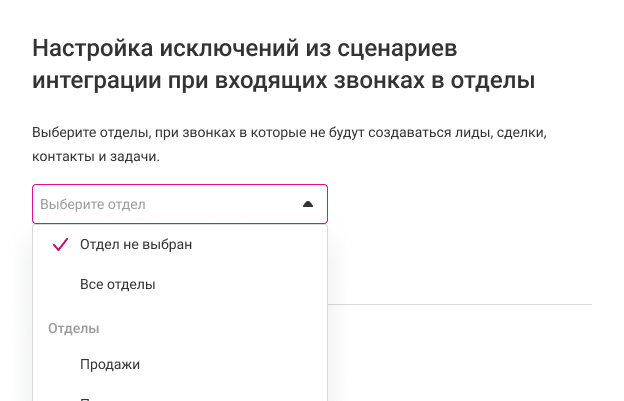 Если у вас настроен единый сценарий интеграции с Битрикс24 для всех номеров и при входящих в отделы создаются лиды, сделки, контакты и задачи, то вы можете настроить исключения из общего сценария для тех отделов, которые не пользуются CRM. Например, сделать так, чтобы при звонке на внутренний номер бухгалтерии никаких новых сущностей в CRM не создавалось. Далее мы расскажем, как это сделать.
