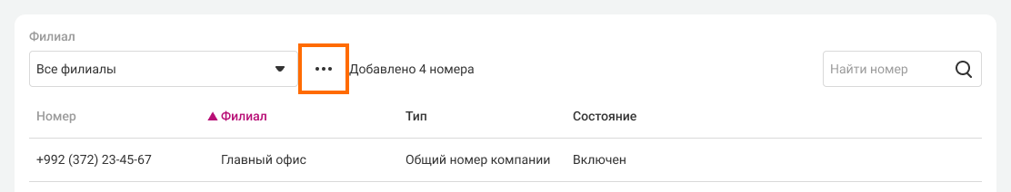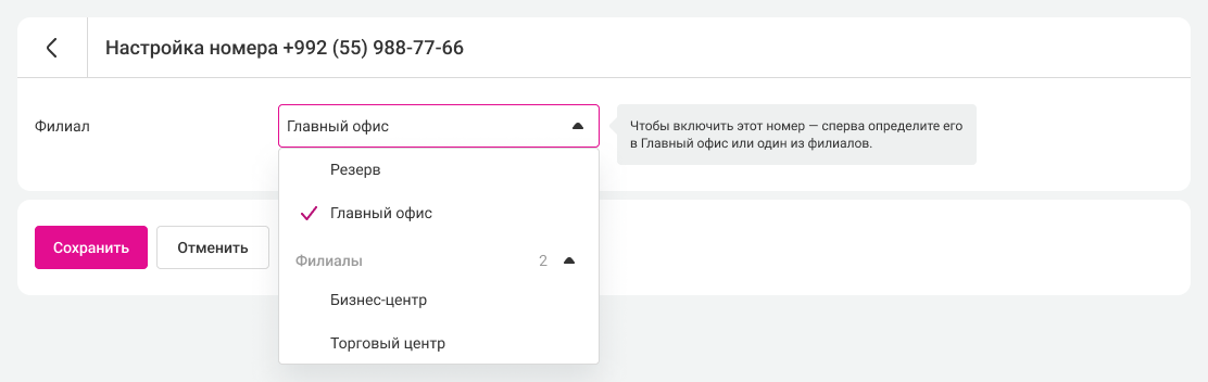 • Состояние – выключен или включен. Номер можно выключить в настройках номеров внутри филиала или в кабинете управления филиалами, если добавить его в резерв.