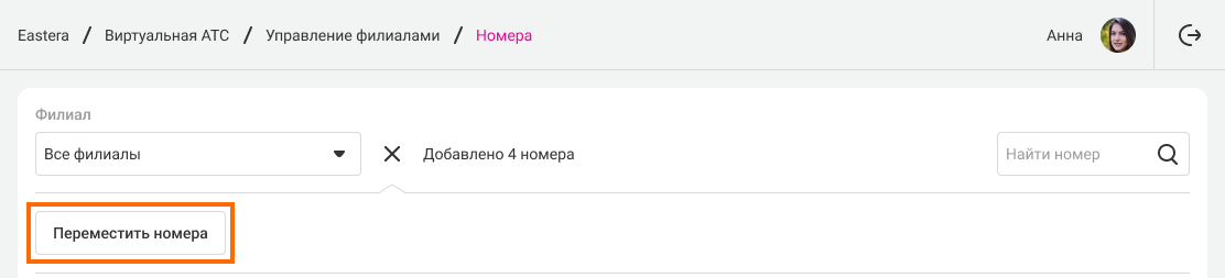 4. Нажмите на кнопку «Переместить». Теперь выбранные номера относятся к указанному филиалу.