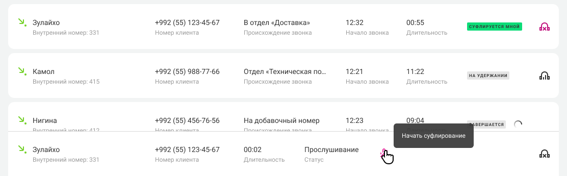 Чтобы узнать, какие сотрудники и с кем сейчас разговаривают по телефону, зайдите во вкладку «Суфлирование» и выберите звонок с иконкой наушников справа.