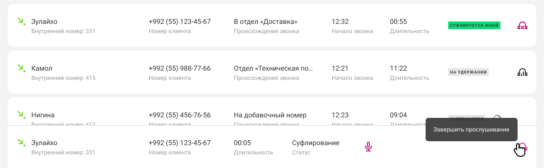 Звонок, к которому вы подключились, будет закреплен в нижней части экрана. Здесь вы увидите ключевую информацию по вызову: имя сотрудника, номер клиента, длительность вашего подключения к звонку и статус (прослушивание или суфлирование).