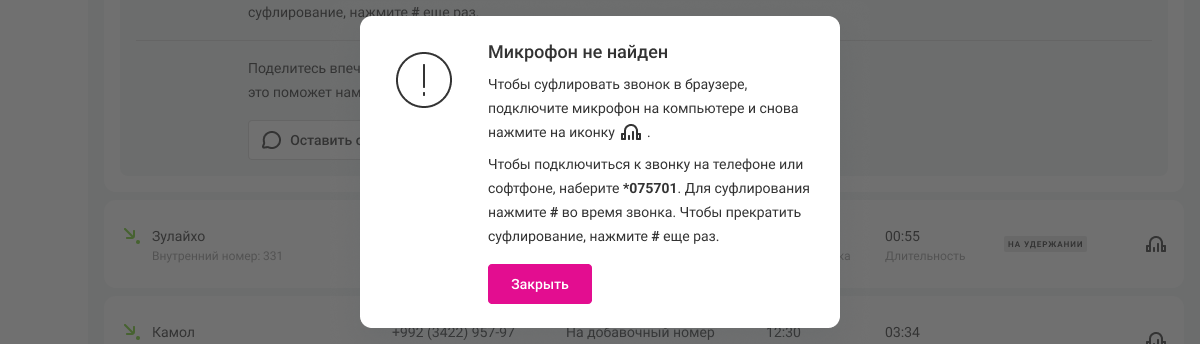 Обратите внимание: прослушивать и суфлировать звонок через интерфейс можно, только подключив к компьютеру микрофон. Иначе при нажатии на иконку наушников появится такое уведомление.