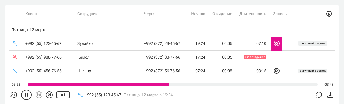 Кроме того, в истории можно прослушать записи звонков, заказанных через виджет обратного звонка с сайта.