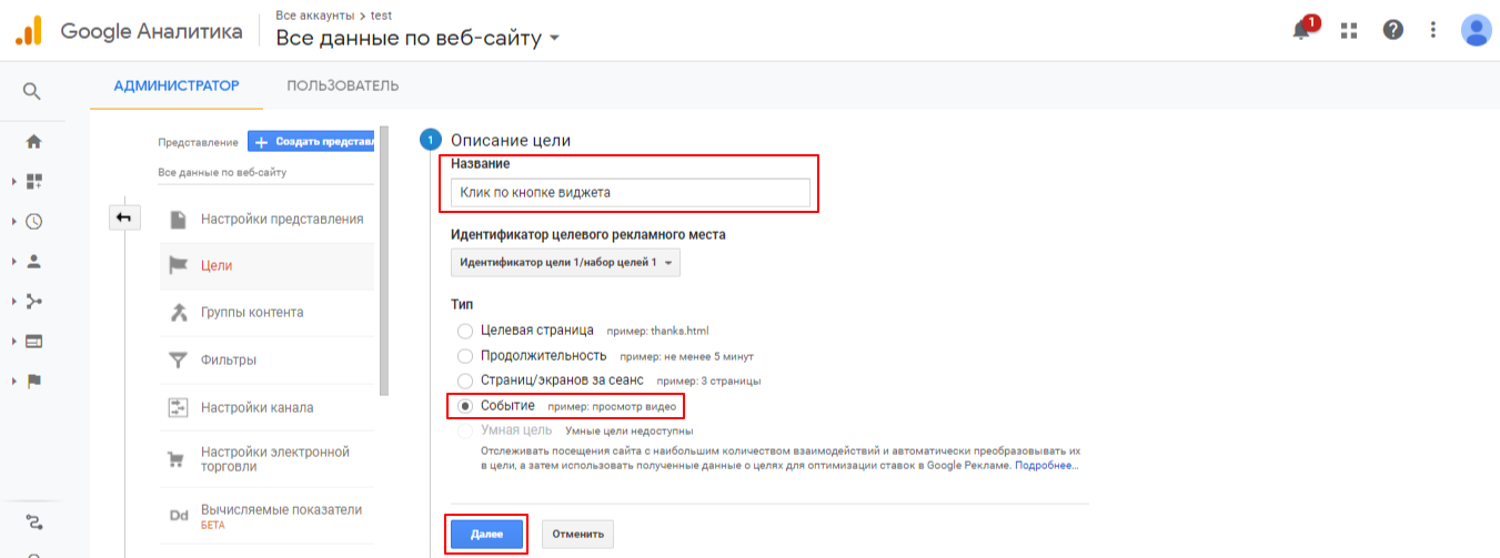 7. Выберите тип цели – «Событие» и нажмите «Далее».