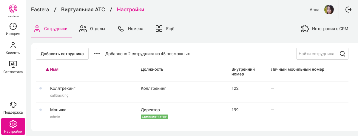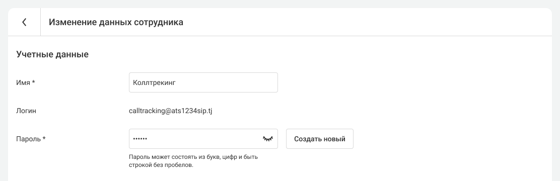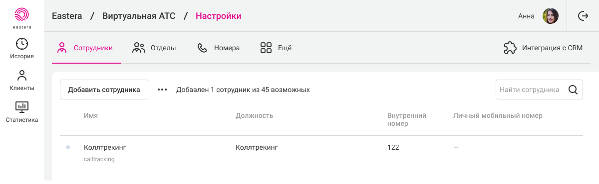 1. В АТС перейдите в раздел «Сотрудники» и добавьте нового сотрудника. Можно использовать существующего сотрудника. Рекомендуем в имени сотрудника использовать слово «Коллтрекинг», чтобы не путать его с реальными пользователями.