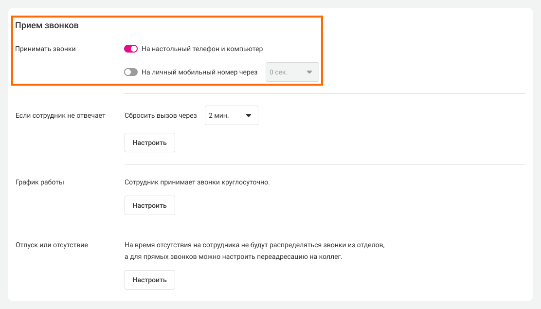 8. Включите сотруднику прием звонков в его профиле АТС.