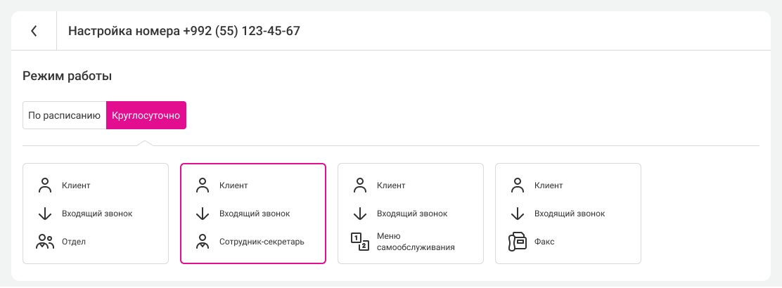 3. Настройте переадресацию, выбрав режим работы «Круглосуточно» и сценарий перевода звонков на сотрудника-секретаря.