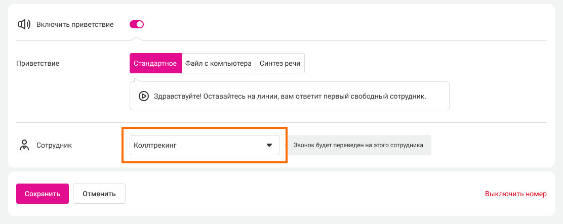 calltracking.ru будет использовать эту переадресацию, чтобы переводить обработанные вызовы на менеджера в АТС. Осталось выбрать сотрудника, который будет принимать звонки.