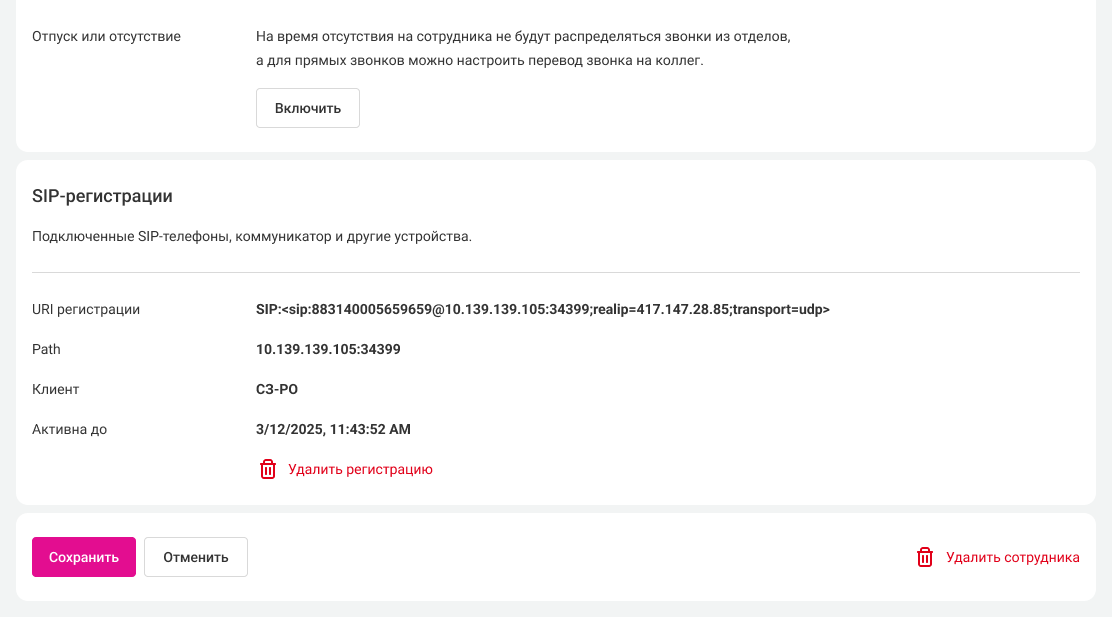 Когда техническая поддержка calltracking.ru закончит настройку, у сотрудника, созданного для коллтрекинга, в профиле АТС появится SIP-регистрация.