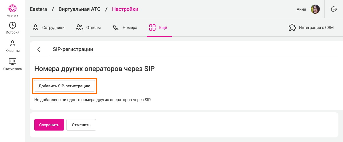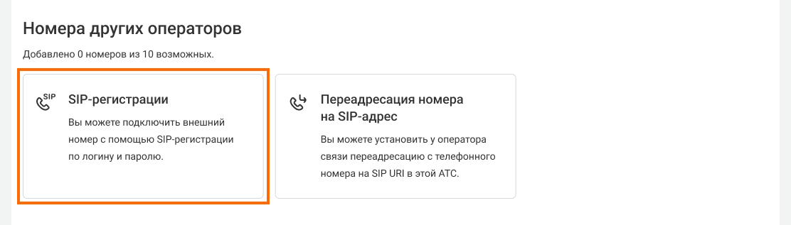 1. В кабинете АТС перейдите в раздел «Еще» — «Номера других операторов» — «SIP‑регистрации».