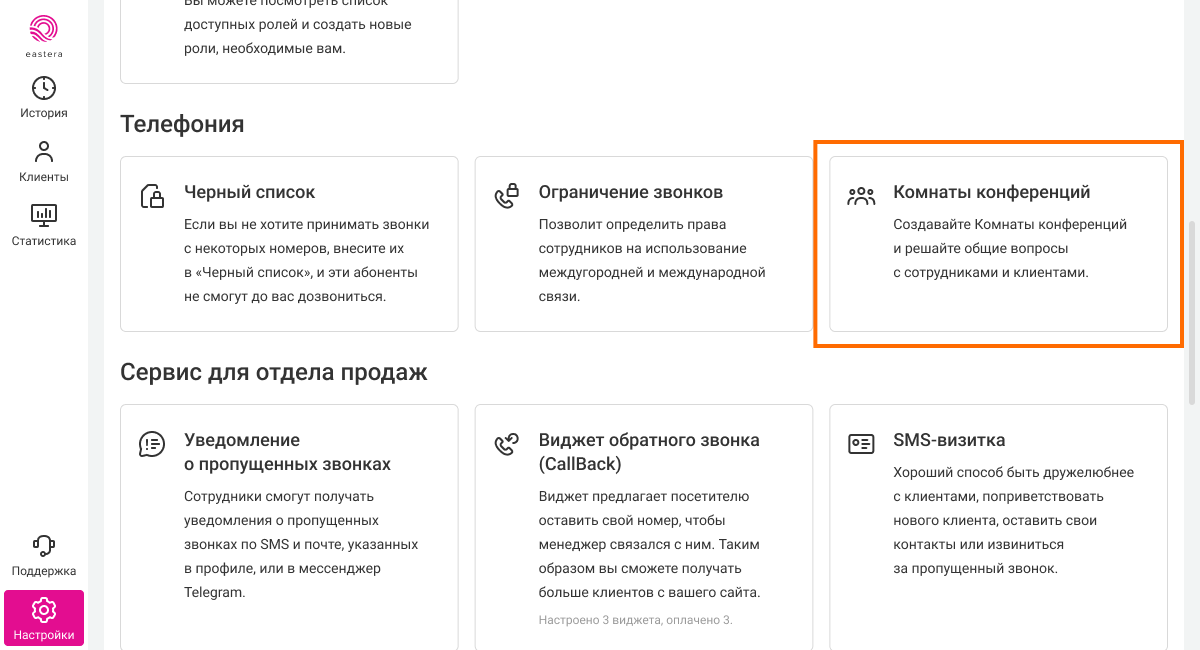 1. В настройках Виртуальной АТС нажмите кнопку «Еще», и в разделе «Телефония» кликните на «Комнаты конференций».