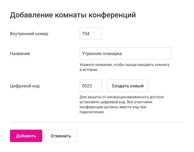 3. Придумайте название конференции и внутренний номер (адрес) комнаты. Он поможет участникам быстро присоединиться к встрече.