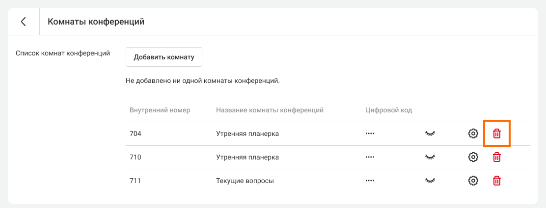 Если комната конференций вам больше не нужна, найдите ее в списке комнат и нажмите на «корзину» справа.