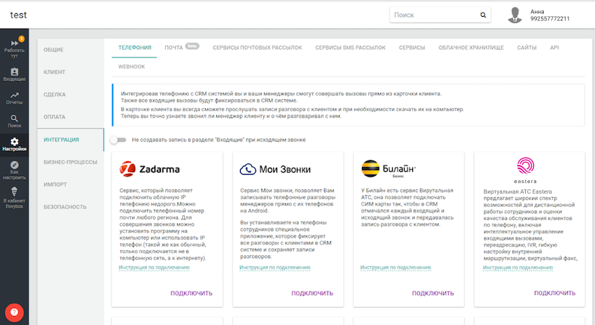 Для настройки телефонии, выбираем «Настройки» → «Интеграции» → «Телефония» → «Виртуальная АТС Eastera».