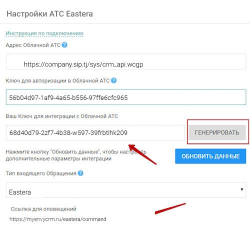 Далее в настройках CRM-системы нажмите «Генерировать», скопируйте сгенерированный ключ и вставьте его в поле «Ключ для авторизации в вашей CRM» в личном кабинете Виртуальной АТС.