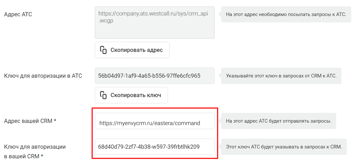Далее вернитесь в CRM-систему, скопируйте ссылку «Ссылка для оповещений» и вставьте её в поле «Адрес вашей CRM» в личном кабинете АТС.