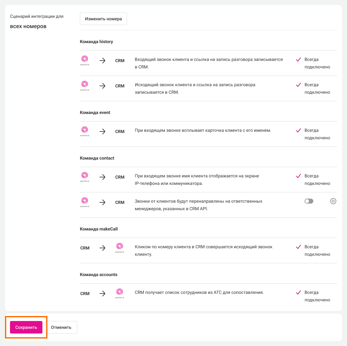 Вернитесь в настройки CRM-системы, укажите внутренние номера сотрудников и нажмите кнопку «Сохранить». На этом интеграция с Виртуальной АТС будет завершена.