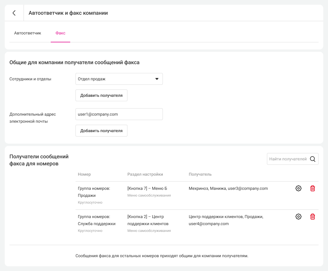 В этом разделе, помимо настроек общего факса компании, вы можете изменять получателей факса для выбранных номеров. Чтобы изменить настройки, кликните на шестеренку справа от выбранного номера. В открывшемся окне вы можете добавить или удалить получателей факса, а также указать дополнительные электронные адреса, куда будут отправляться факсы.