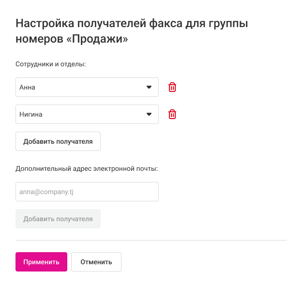Чтобы удалить настройки факса номера, в блоке «Получатели факса» нажмите на корзину справа от этого номера.