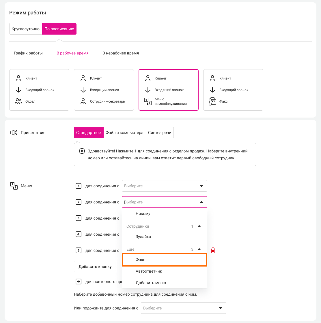 Выберите режим работы «Круглосуточно» и вариант распределения звонков на «Голосовое меню». Назначьте факс на одну из кнопок голосового меню.