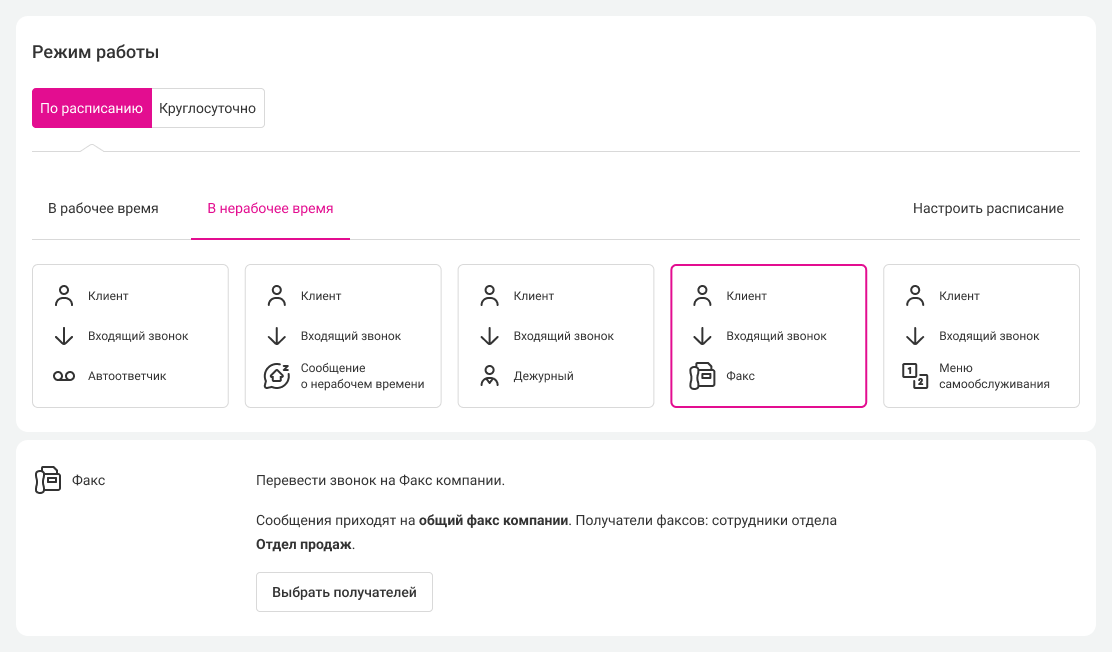 В разделе «Номера» выберите режим работы «По расписанию» и во вкладке «В нерабочее время» выберите перевод входящего звонка на факс.