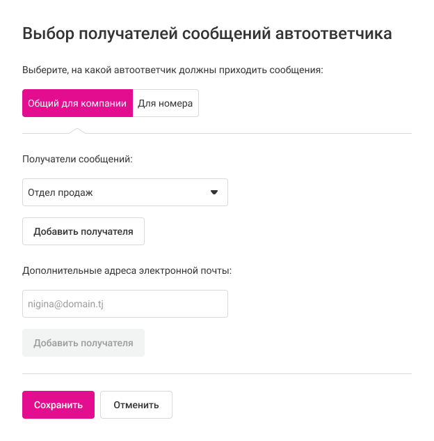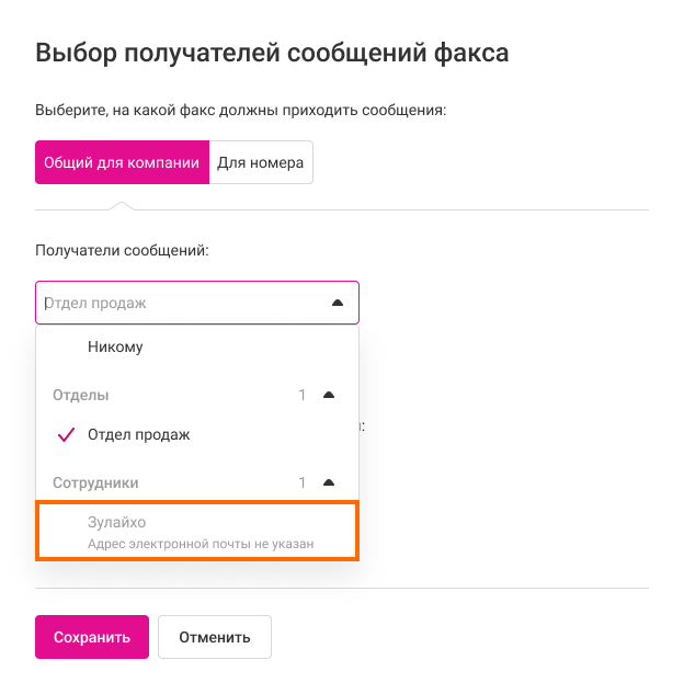 • Общий для компании — голосовые сообщения будут приходить всем получателям сообщений общего факса компании;
